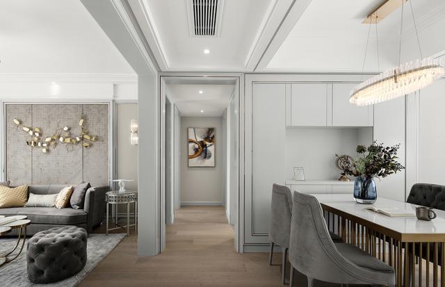 除了在过道尽头挂画,如果有空间,还可以定制一个柜子。柜子的颜色要尽量浅,比如白色的柜子,视觉上不会显得拥挤,同时还可以增加很多收纳空间!