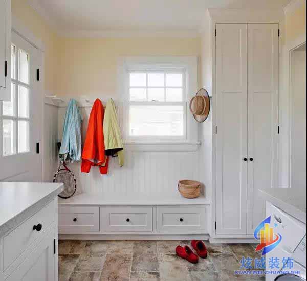 如果进门左右两侧都有空间,那吊柜的底板可以直接装到头,一直挨着房门两侧的墙壁安装,形成两头封闭的U型收纳区,不喜欢U型挂杆,直接将挂杆做成三分离设计,分别挂放不同衣物,而且承重力不在柜子的底板上,将重量分散,挂多少衣物都没关系。